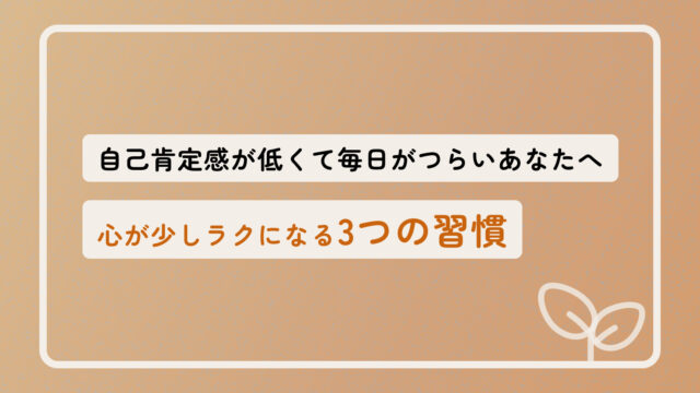 自己肯定感を育む 自己肯定感が低くて毎日がつらいあなたへ|心が少しラクになる3つの習慣 自己肯定感が低くて毎日がつらいと感じるあなたへ。私が実際に試して心が軽くなった3つの習慣を紹介します。落ち込みや不安をやわらげ、自分を少しずつ認められるようになる方法です。 2025.06.28 自己肯定感を育む